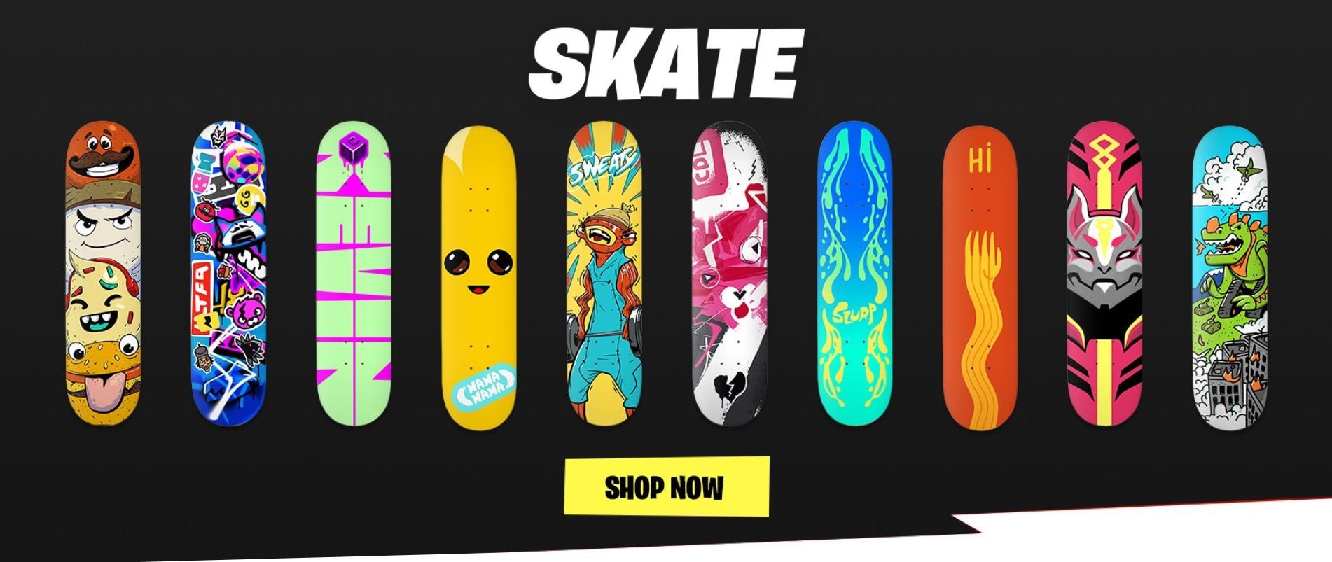 In its unrelenting quest to conquer every corner of the world, Fortnite has set it voracious eyes on the skatepark with a new collection of skate decks based on in-game Back Bling designs from the recent Downtown Drop LTM.
